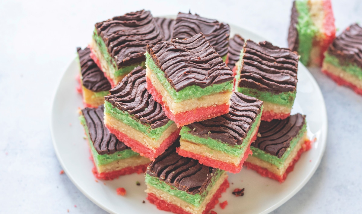 Colorful layers of almond cake are sandwiched with sweet apricot preserves and a layer of decadent dark chocolate in this recipe from the Plantiful cookbook. Bake up a batch for a gift-ready baked treat for friends and family.