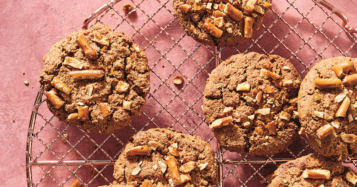 Peanut butter-filled pretzels absorbed my youth, so it felt only right that I pay homage to them with a twist — that twist being tahini! These cookies fall closer to the cake side of the spectrum than the cookie side, which I absolutely adore — especially when contrasted by salty, crunchy pretzels. The sweetness from the coconut sugar and maple, earthiness from the tahini and salty pretzels create the most magical combination that will keep you coming back for more.